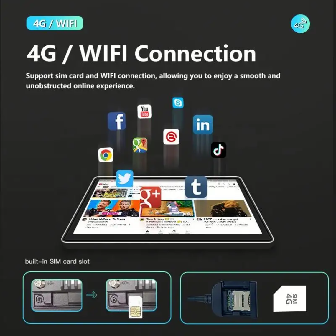 - 4G SIM Slot + Wi-Fi: Built-in cellular support for streaming, online navigation, and app access on the go.