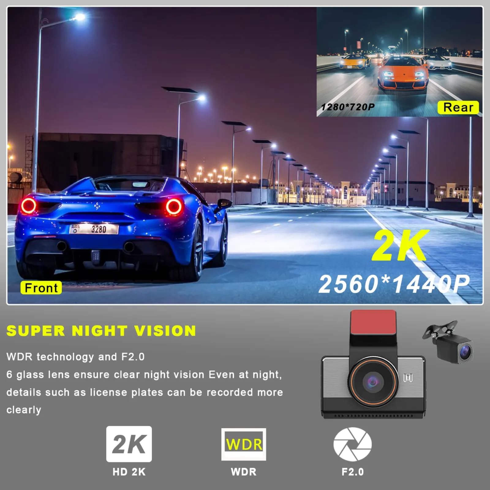 3" screen • 2K (2560×1440P) front recording • Rear camera support • Wi-Fi & App remote • Parking monitor • GPS track history