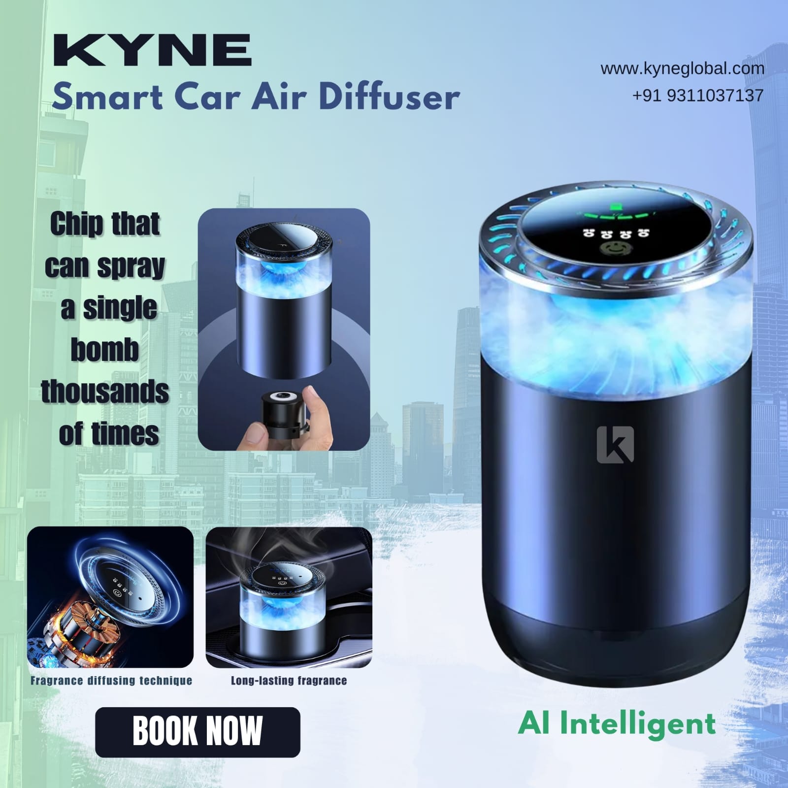 Bring intelligent fragrance to your drives. The KYNE Smart Car Air Diffuser combines AI auto start-stop, long-lasting replaceable scent capsules, a powerful turbine diffuser and four ambient light modes — all alcohol-free and safe for families.